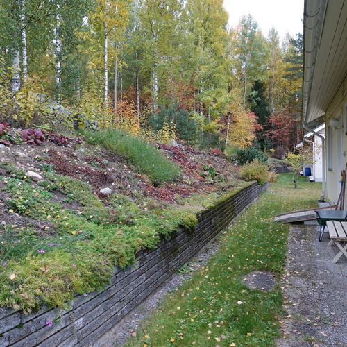 Talo sijaitsee rinnetontilla ja se rajautuu takapihan puolelta metsä-alueeseen.