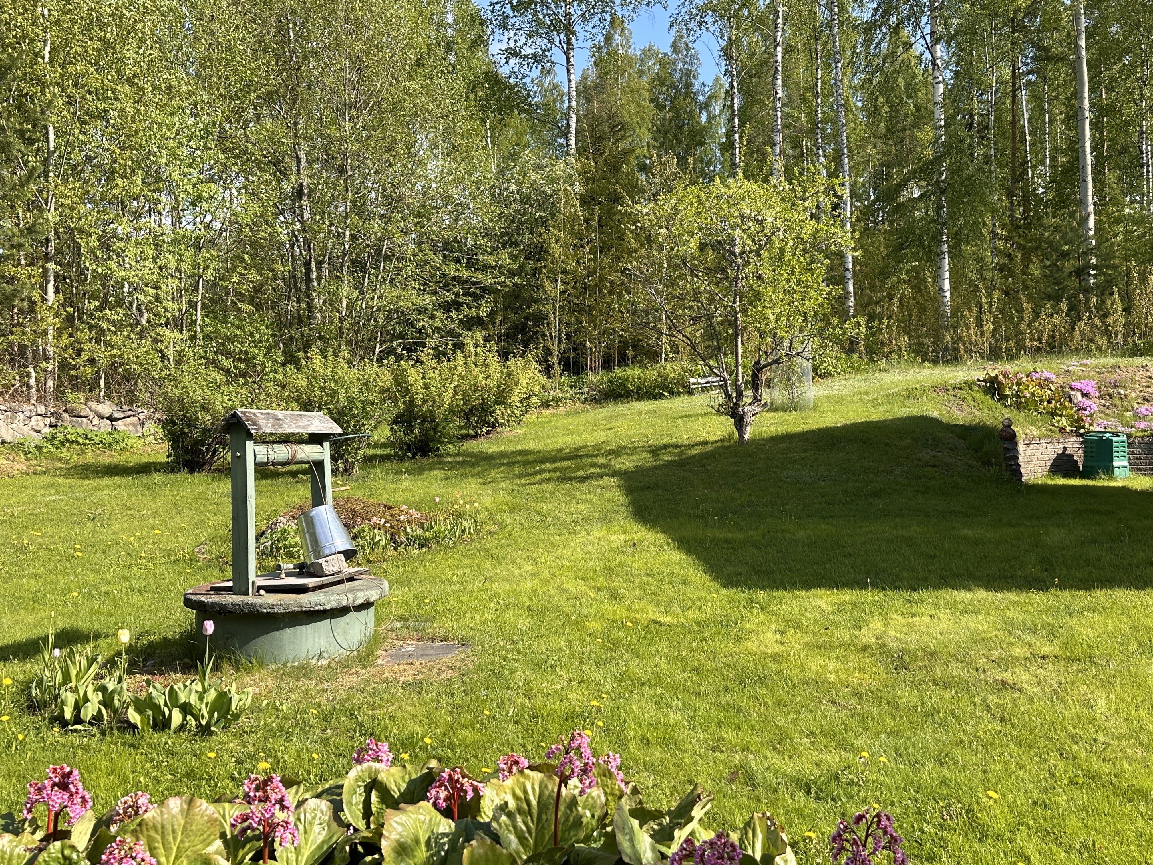 Pihasta löytyy puita ja marjapensaita, sekä talousrakennus, jossa varastotilaa.