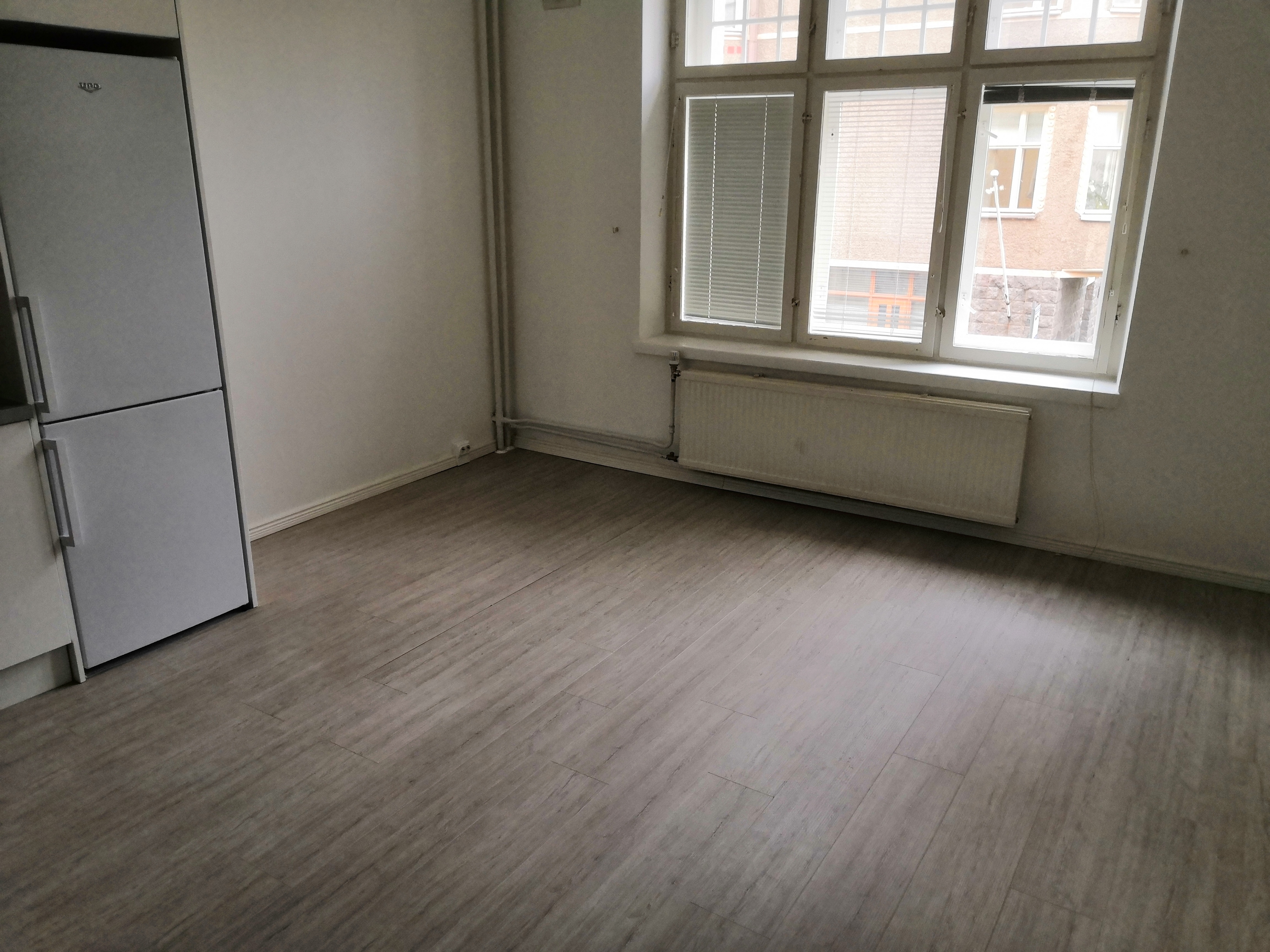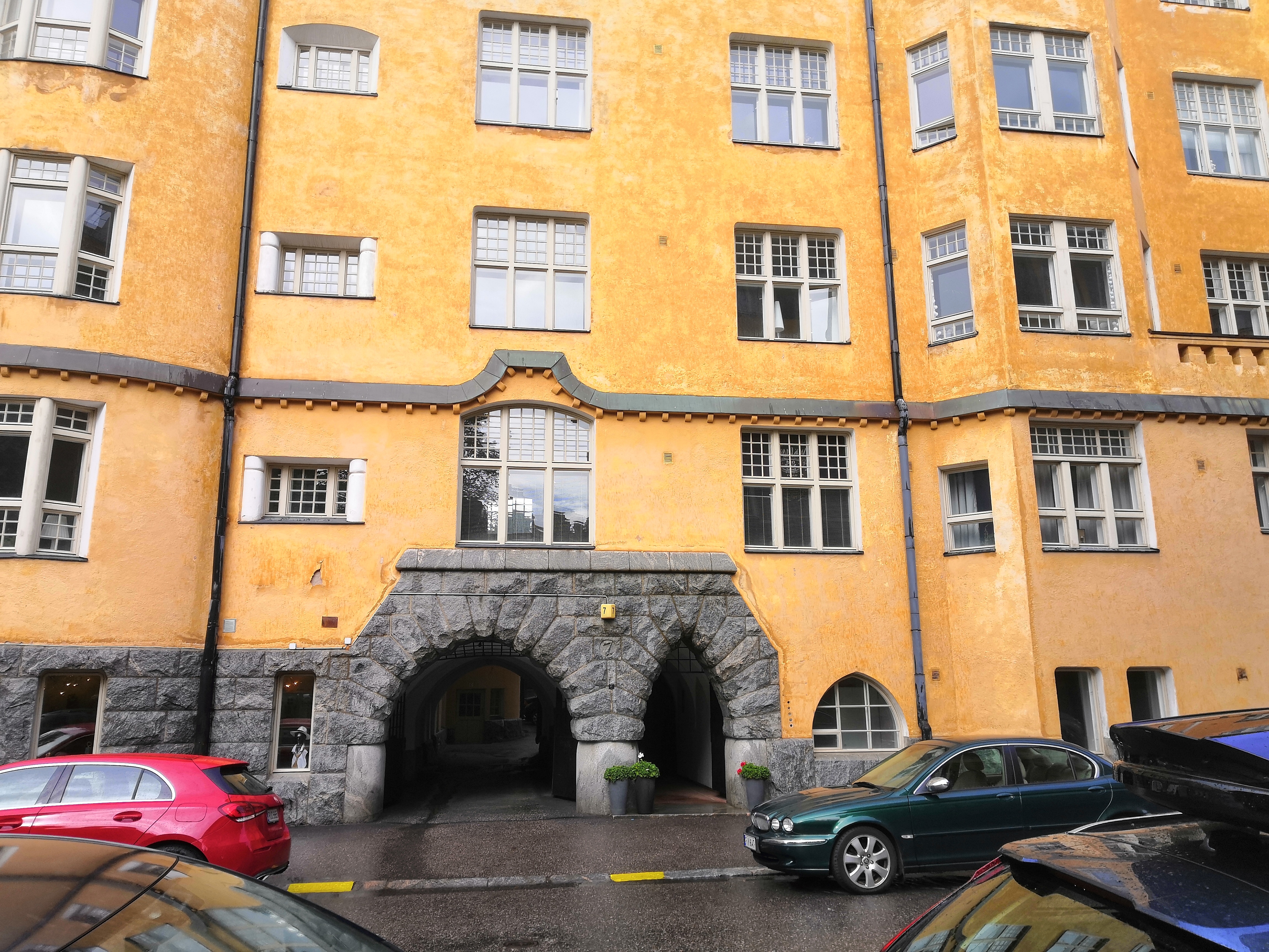 Alkuaan talossa oli vain suuria huoneistoja, mutta aikojen saatossa ns. palvelijan huoneita on erotettu omiksi yksiöiksi. Tämäkin yksiö on erotettu isommasta asunnosta ja yhtiöjärjestyksen muutos on parhaillaan hyväksyttävänä Kaupparekisterissä. Asunto sijaitsee taloyhtiön toisessa kerroksessa ja tarjoaa yli kolmen metrin huonekorkeuden, alkuperäisen luonnonkivestä muuratun takan sekä suuren ikkunan leveine ikkunapenkkeineen. Ikkunasta avautuu näkymä neljän taloyhtiön yksityiseen, vehreään puistoon, jonne voit viedä ystäväsi piknikille tai varata puiston vaikka perhejuhlia varten.