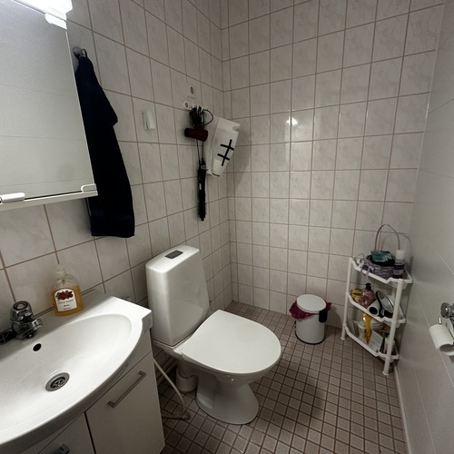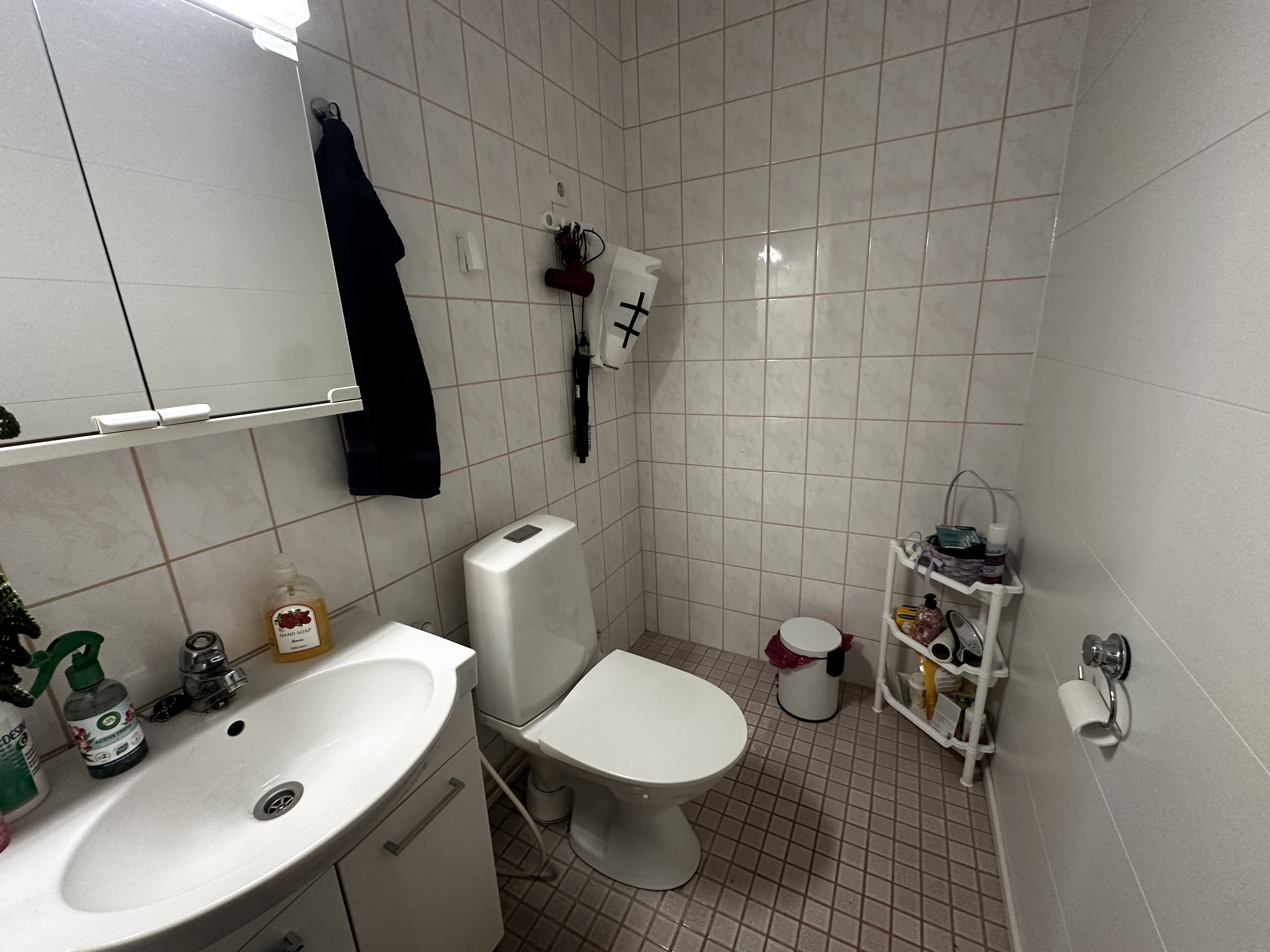 Varusteet: lattiaan asennettu WC, allaskaappi, peilikaappi