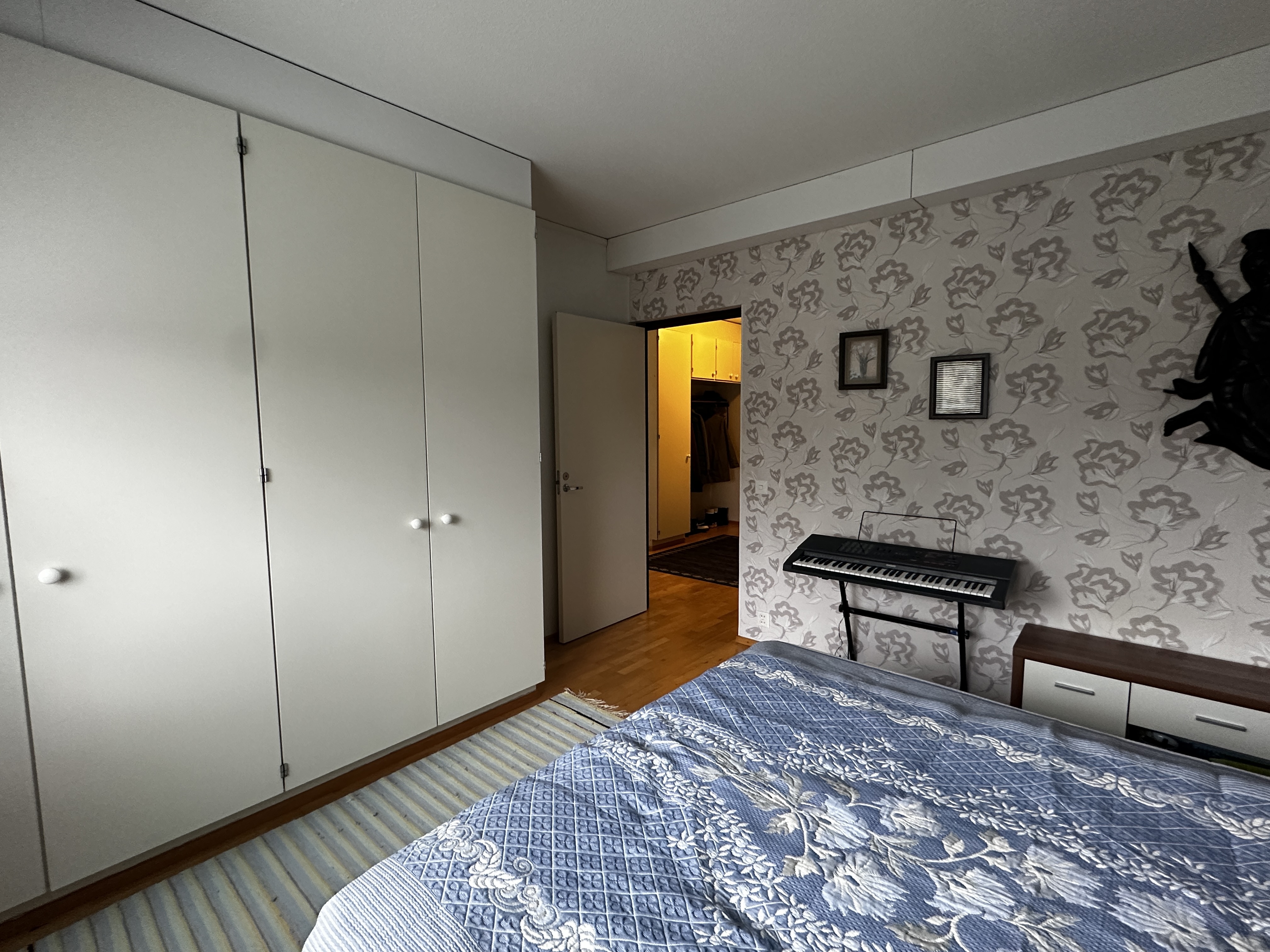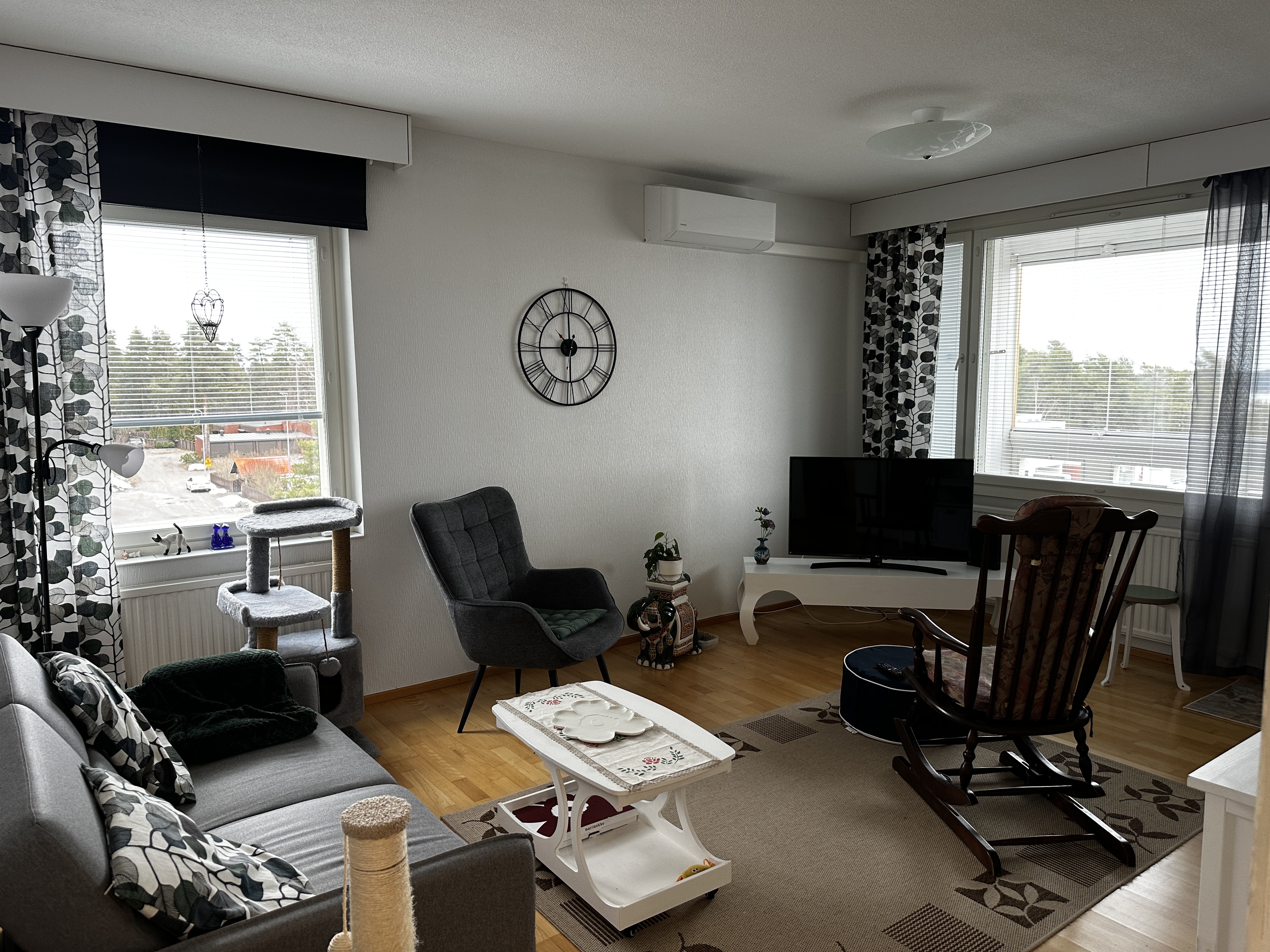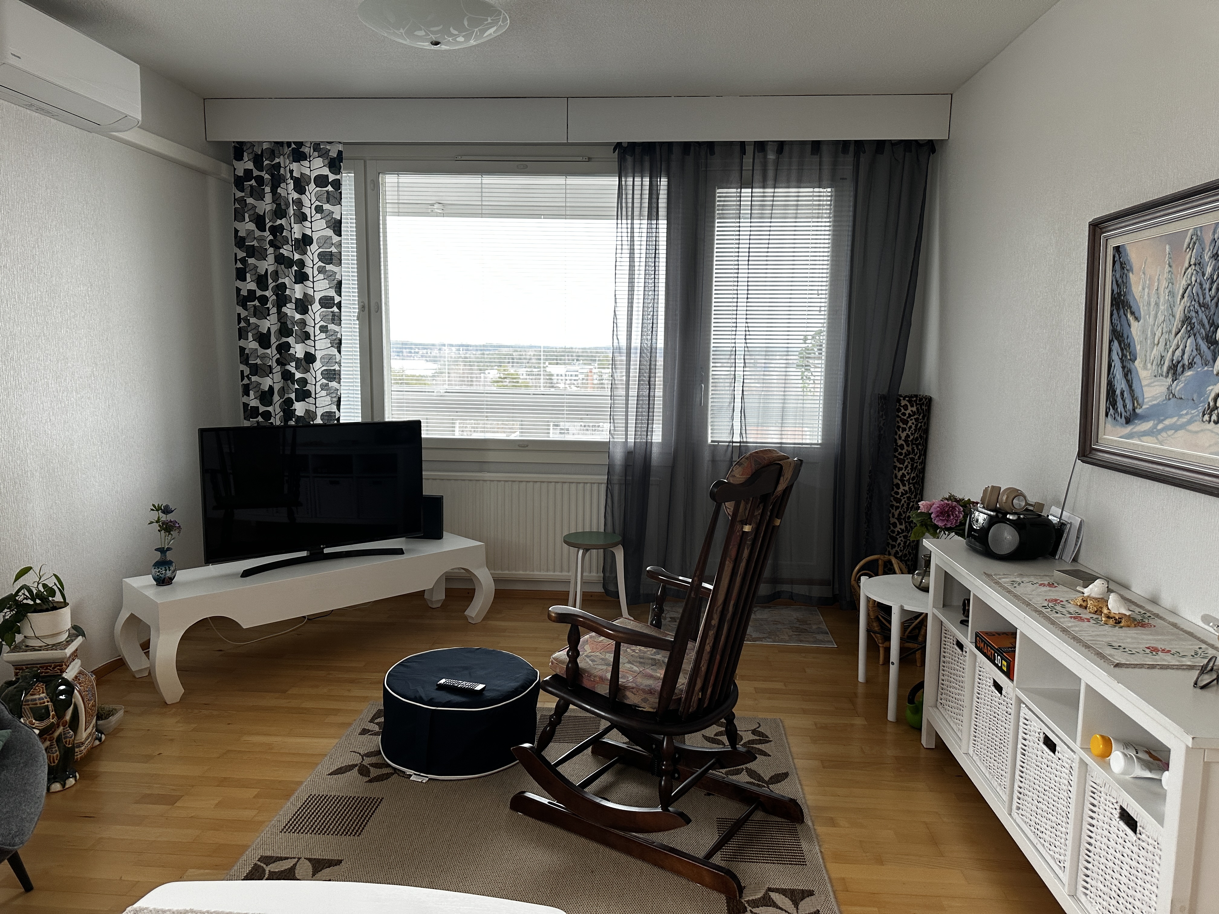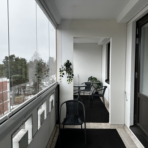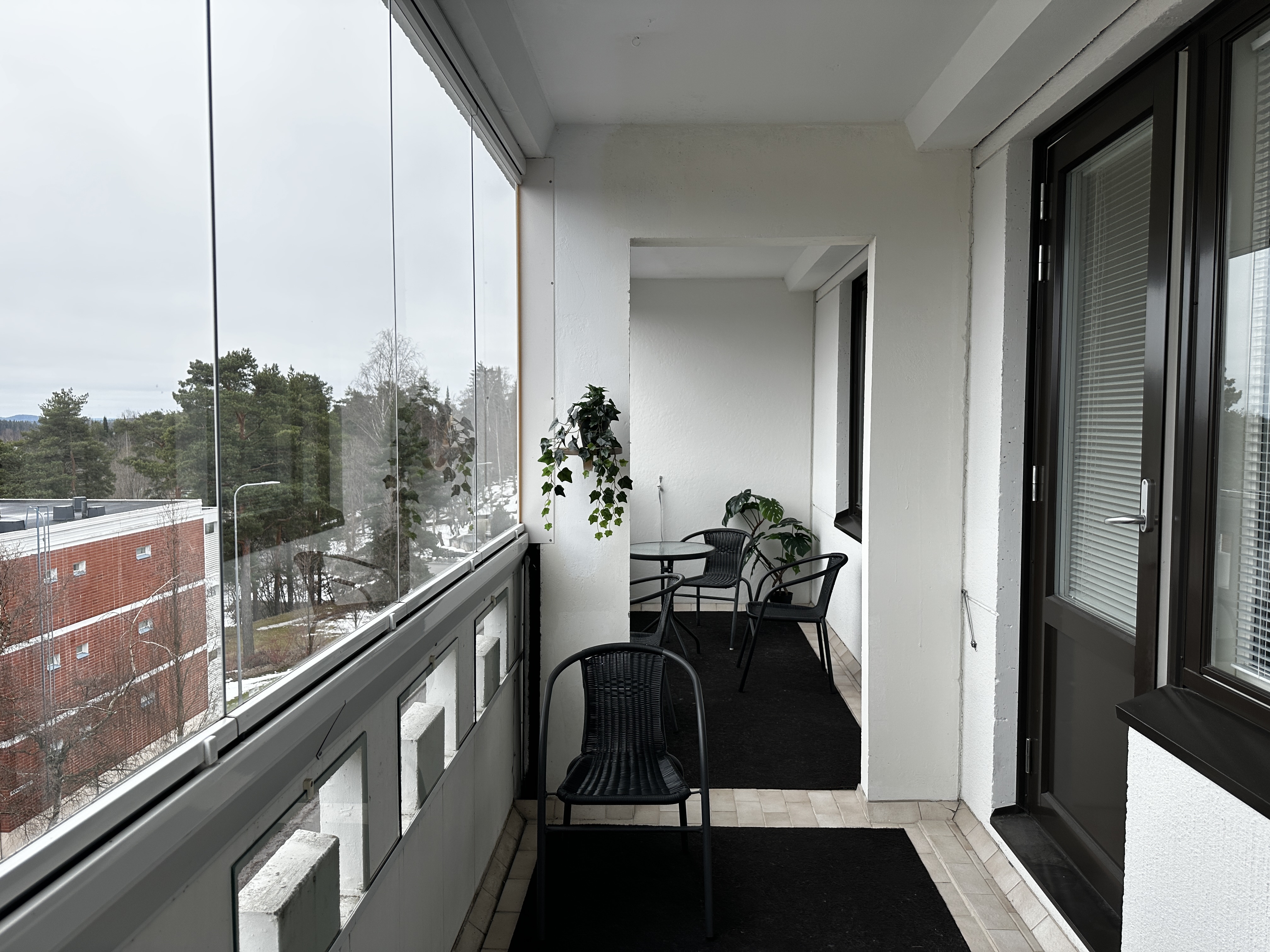 Tässä kolmiossa on väljyyttä. Huoneistolle kuuluu todella leveä lasitettu parveke. Asunto käsittää olohuoneen, keittiön, kaksi makuuhuonetta, pukuhuoneen, pesuhuoneen, saunan ja tilavan erillisen wc:n