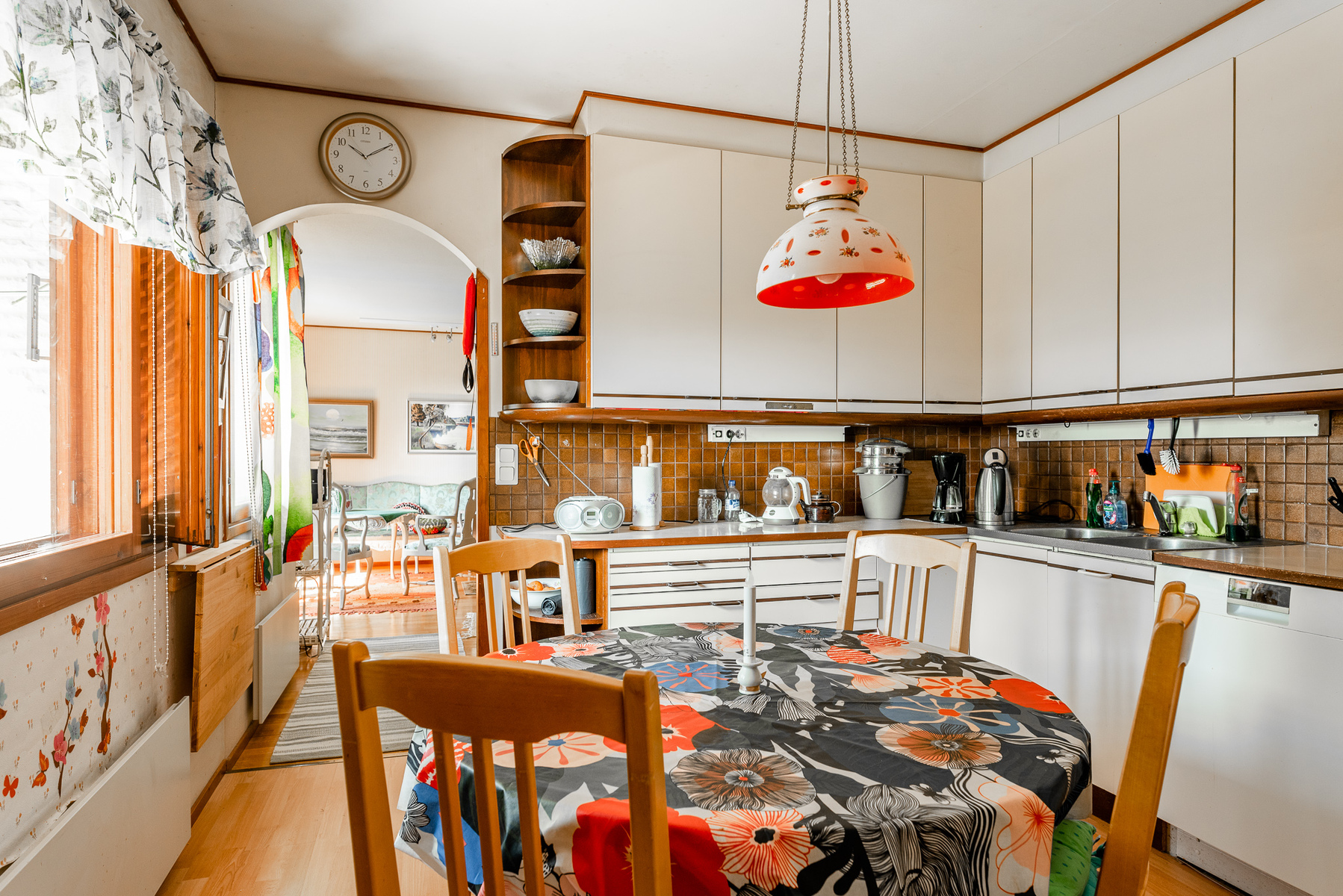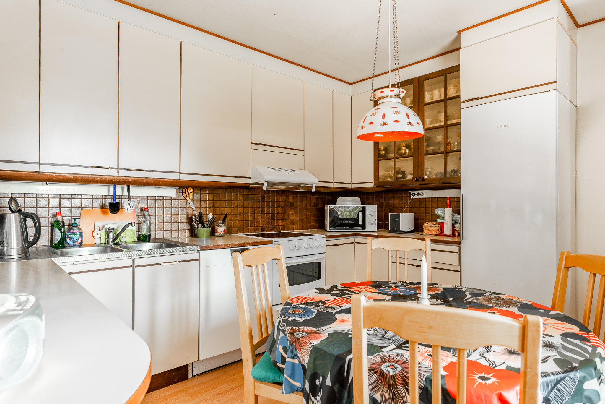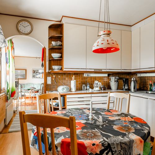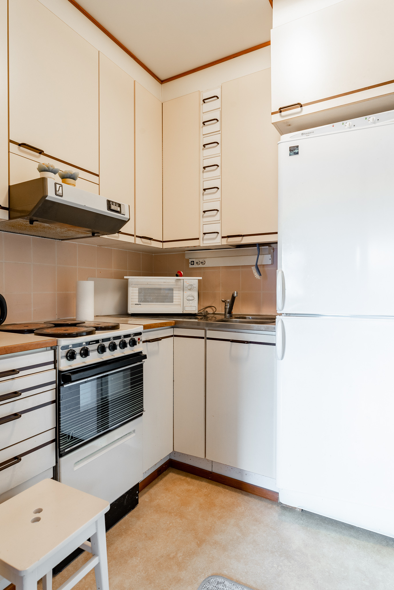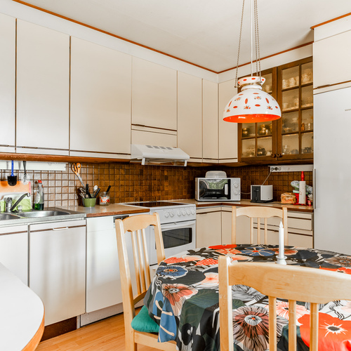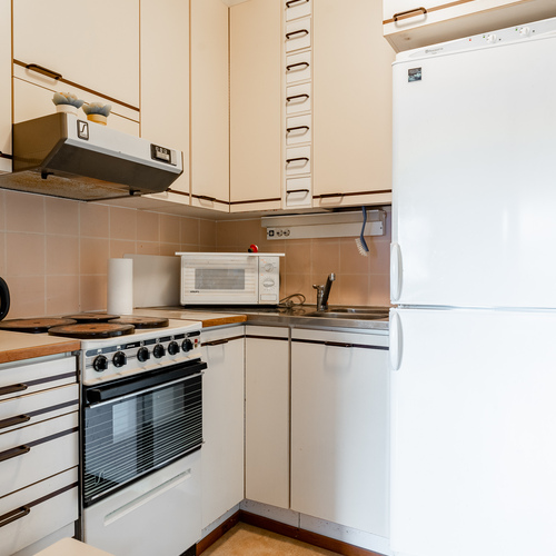 Varusteet: jääkaappi, keraaminen liesi, liesituuletin hormilla, astianpesukone