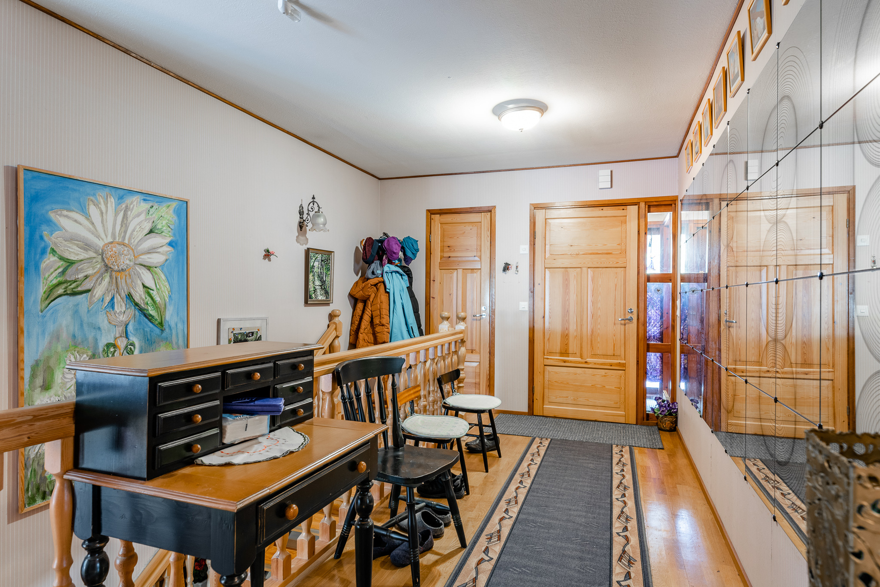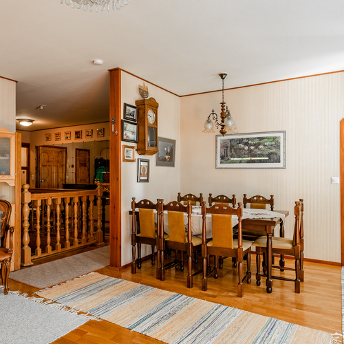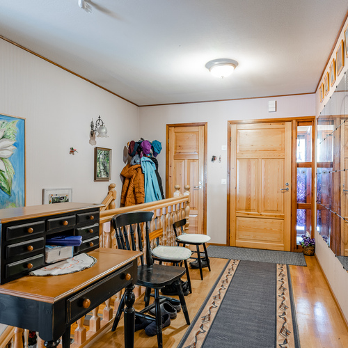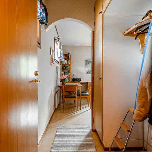 Yläkerrassa on lisäksi olohuone, keittiö, makuuhuone sekä käynti parvekkeelle. Kellarikerroksessa on kaksi huonetta, pukuhuone, pesuhuone, sauna sekä wc.