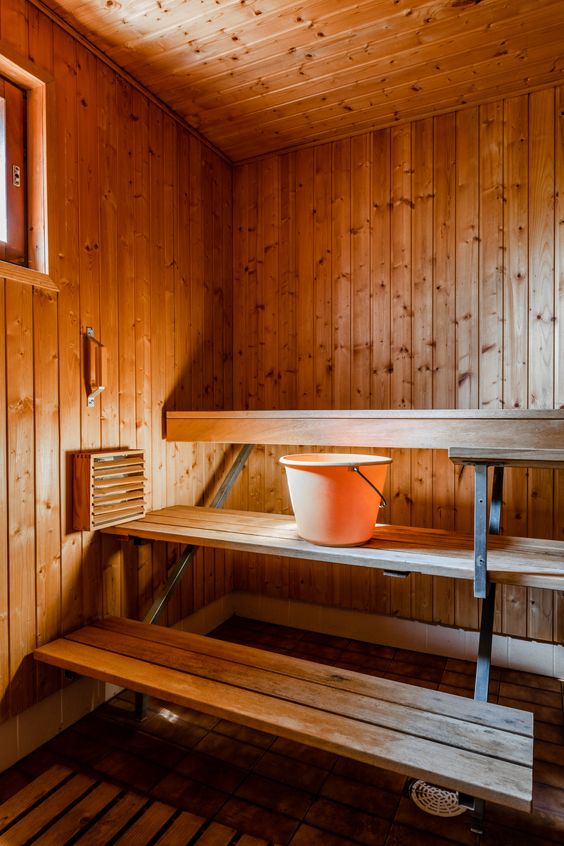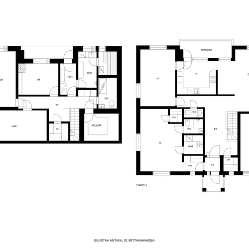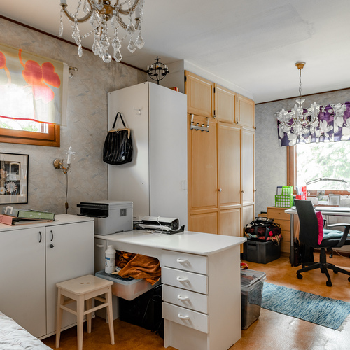 Alakerrassa on kaksi huonetta, kodinhoitohuone, pesuhuone, sauna ja wc sekä varastotilaa.