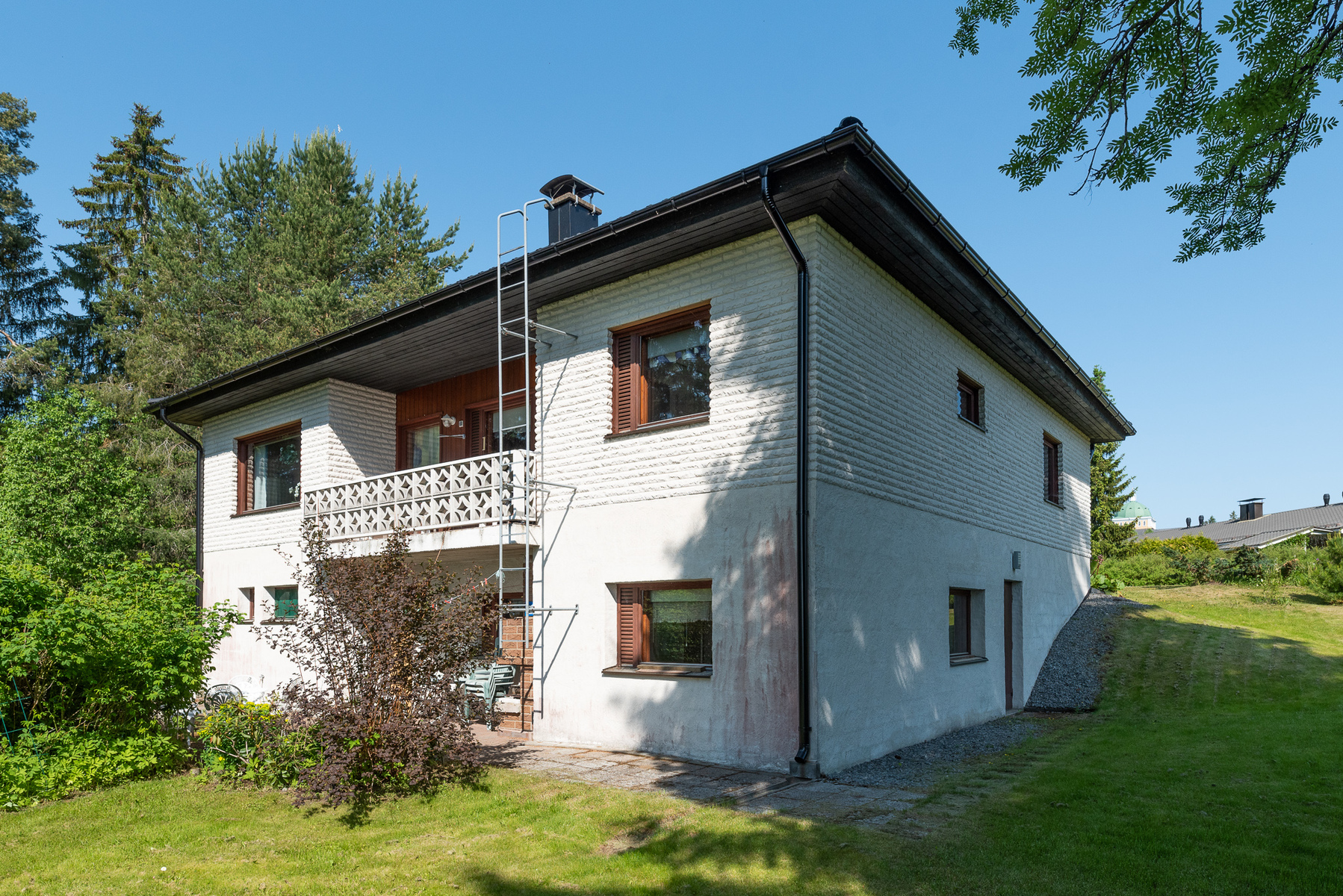 Talo on rakennettu kahden asunnon kokonaisuudeksi ja yläkertaan on rakennettu omalla sisäänkäynnillä ja pesutiloilla oleva yksiö. Yläkerrassa on myös erillinen autotalli.