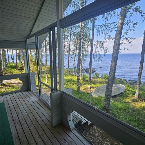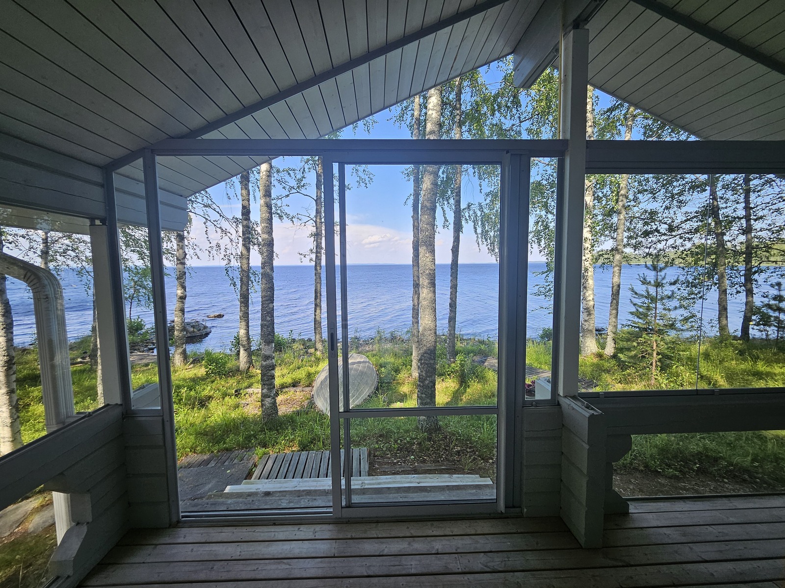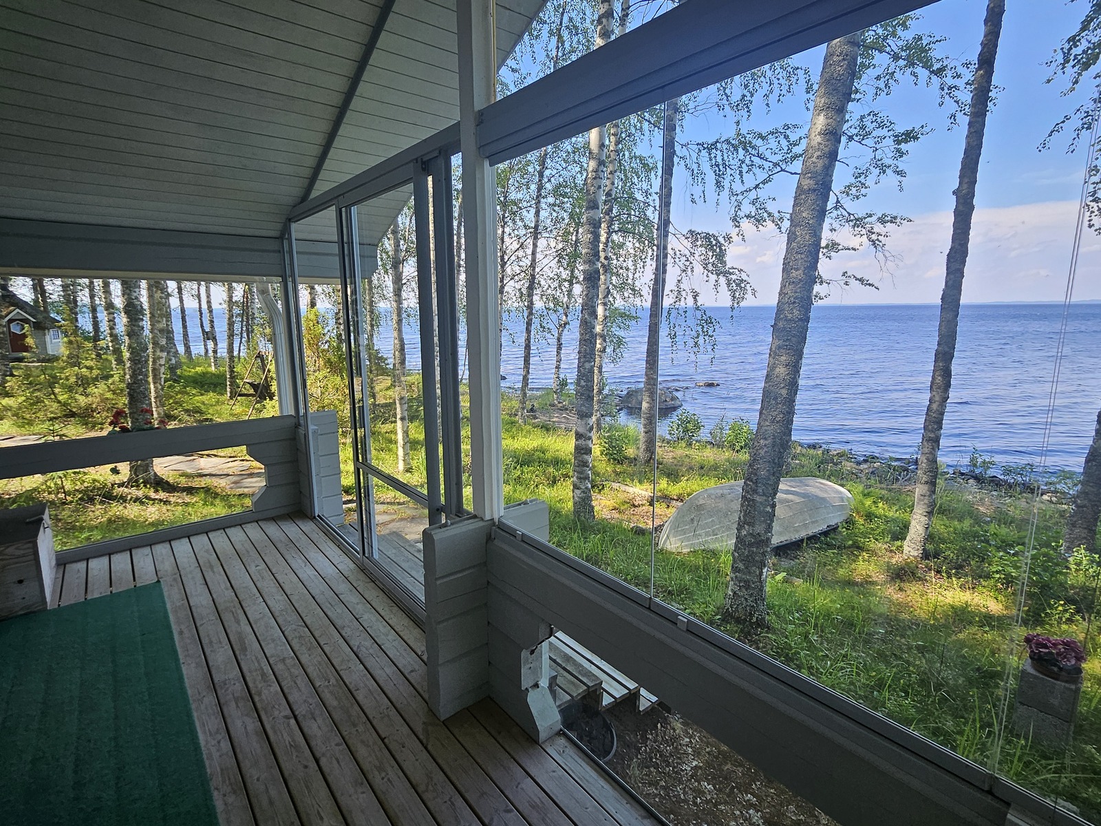 Lasitettu terassi järvelle päin. Lisäksi parvelta pääsee pienelle lasitetulle parvekkeelle.