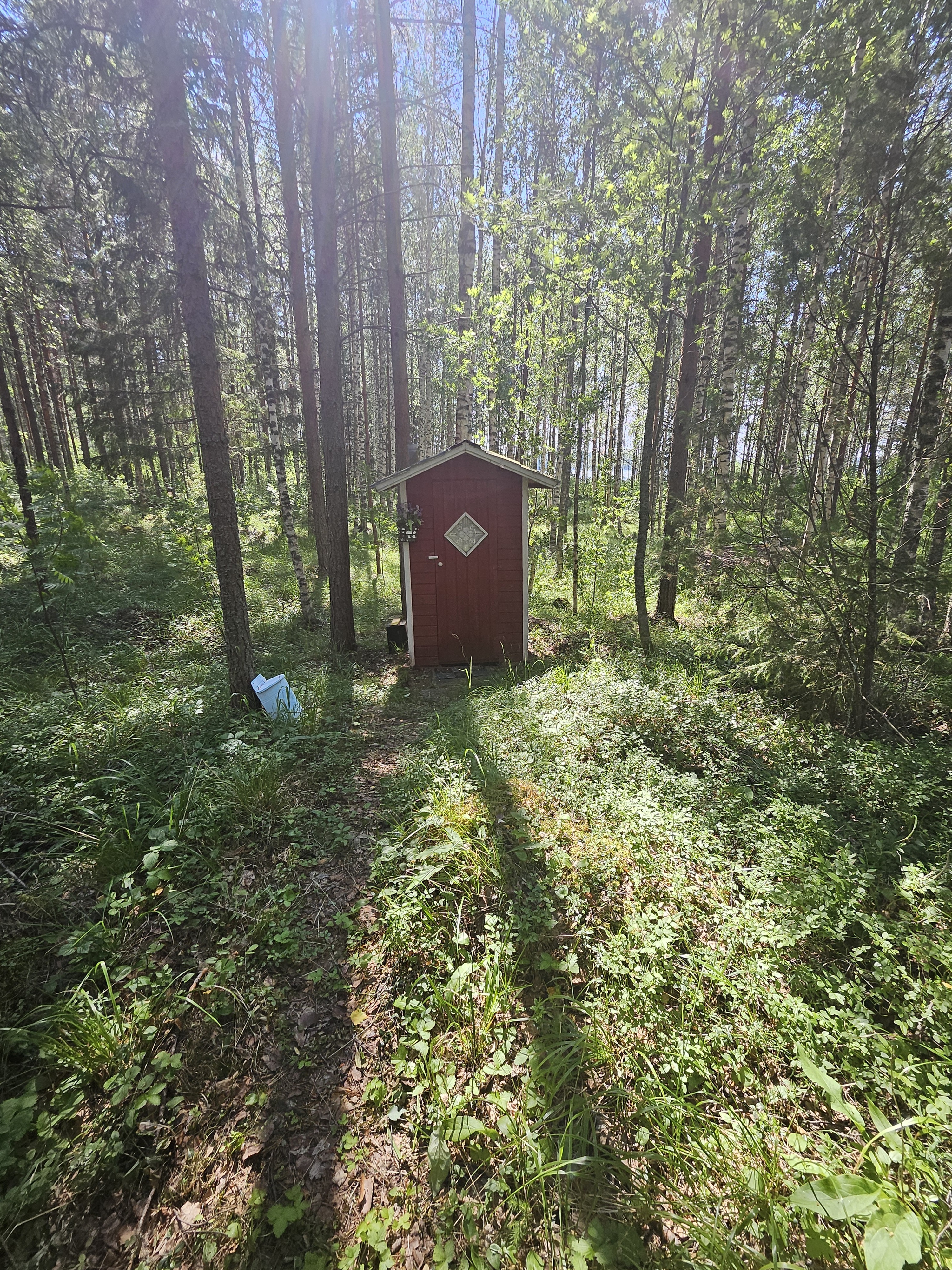 Pihalla grillikota ja huussi. Kulkuväyliä kiveytetty.