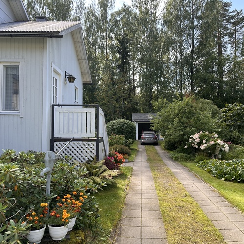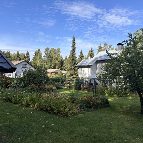 Oma 1200 m²:n kaunis puutarhatontti, joka on pääosin nurmikkoa ja kulkuväylät on kiveytetty.