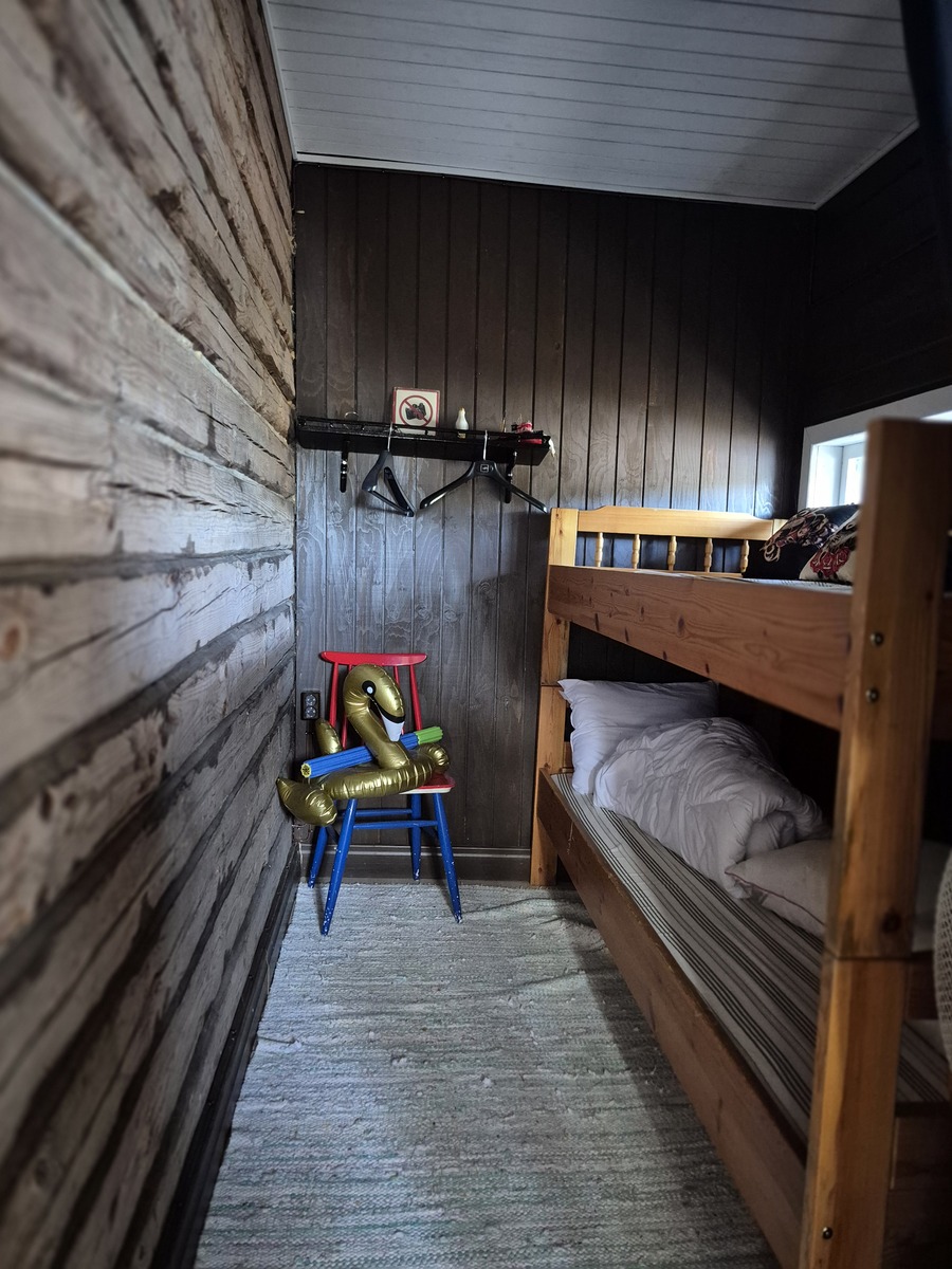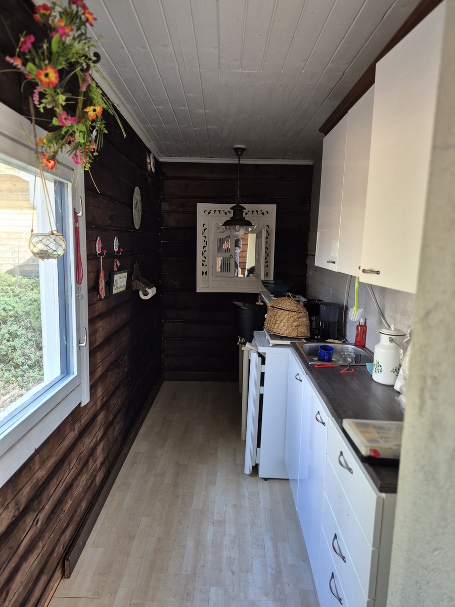 Pääosin vanhoista hirsistä tehty, mutta mökin päädyssä makuutila, joka on lautarakenteinen