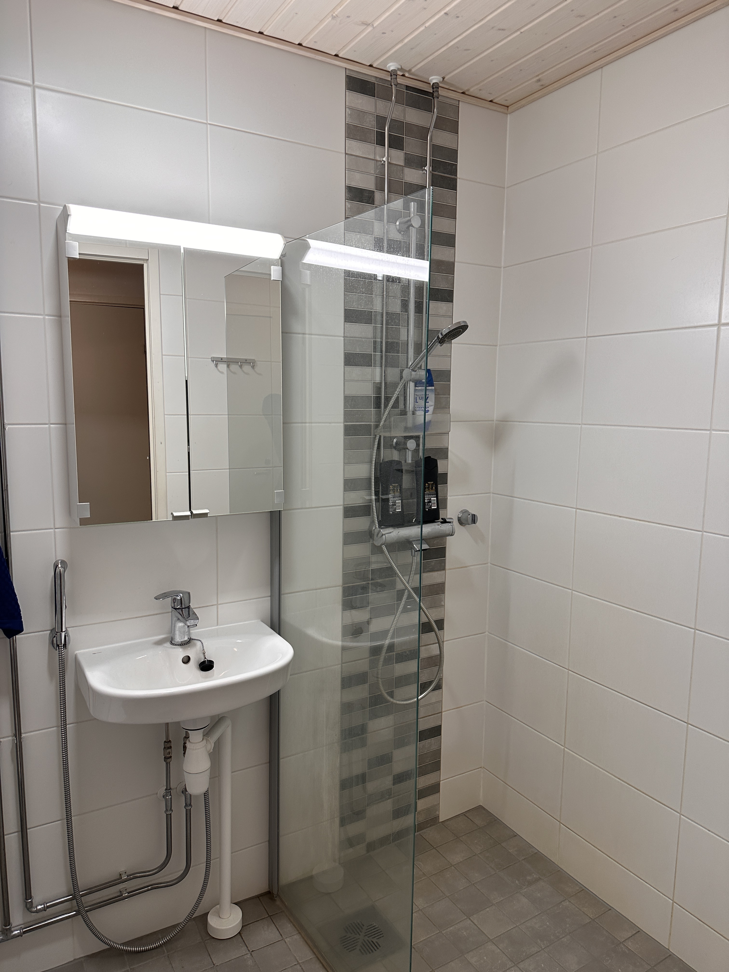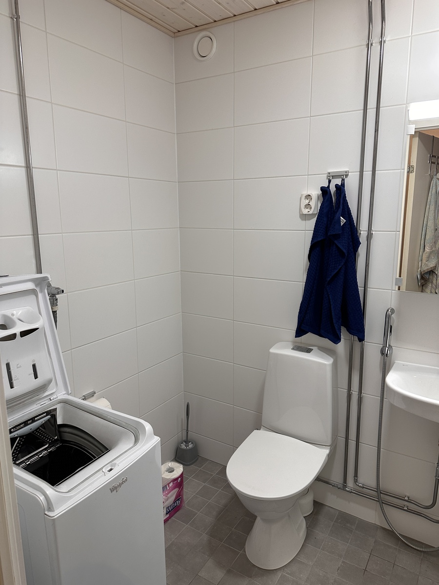 Varusteet: suihku, pesukoneliitäntä, peilikaappi