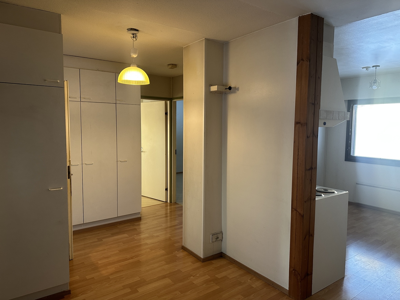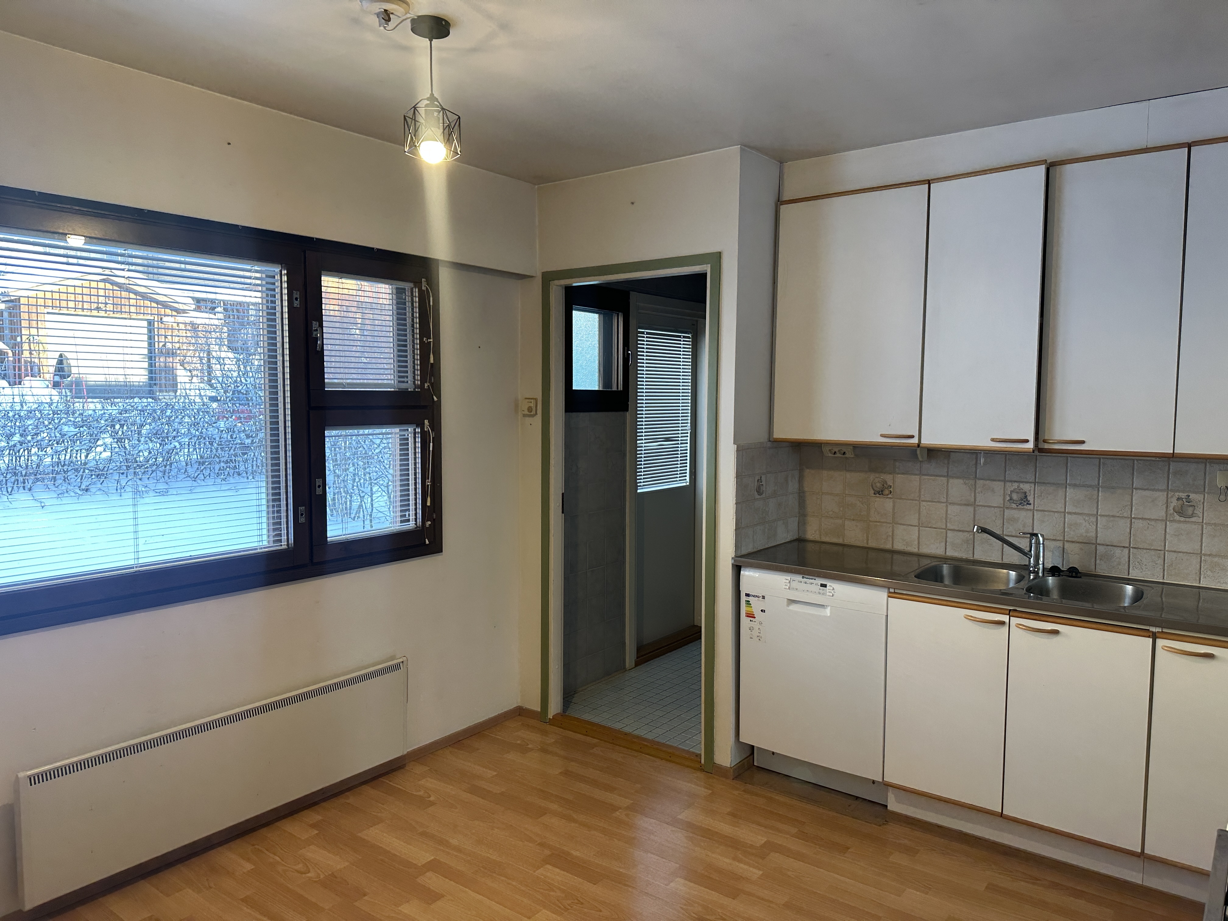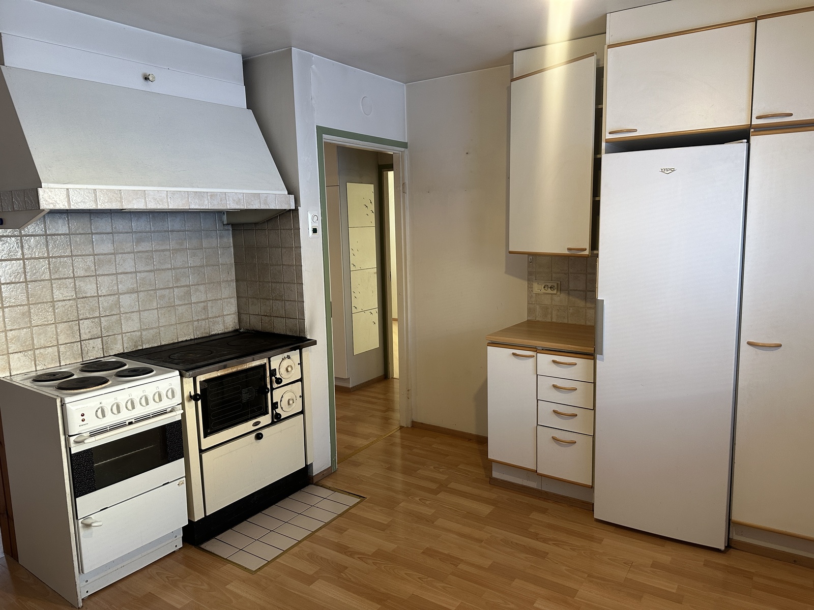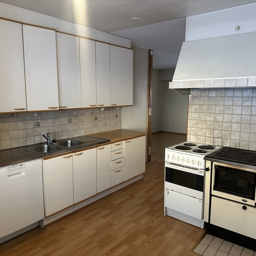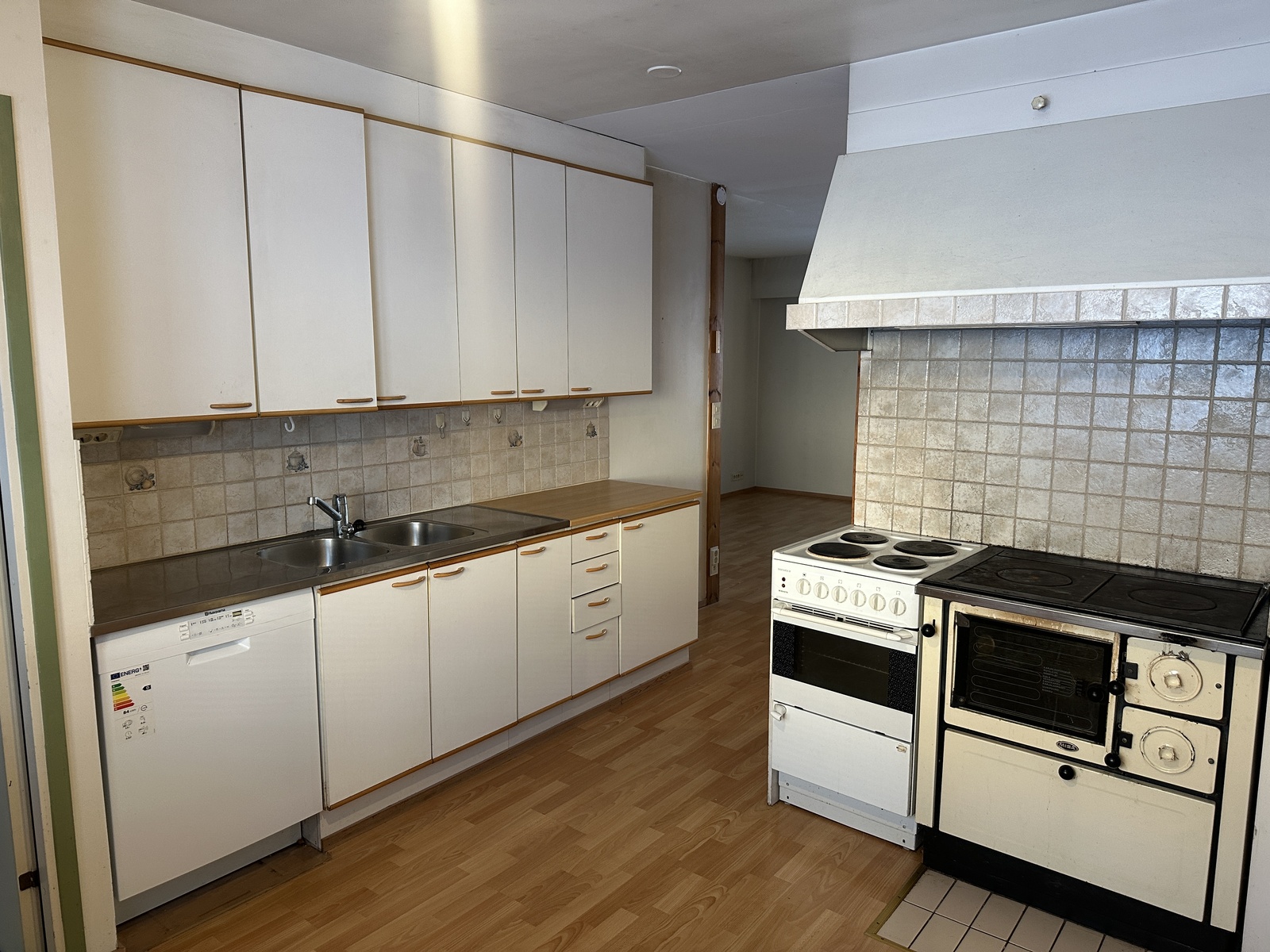 Varusteet: jääkaappi, astianpesukone, sähköliesi, liesikupu, puuhella
