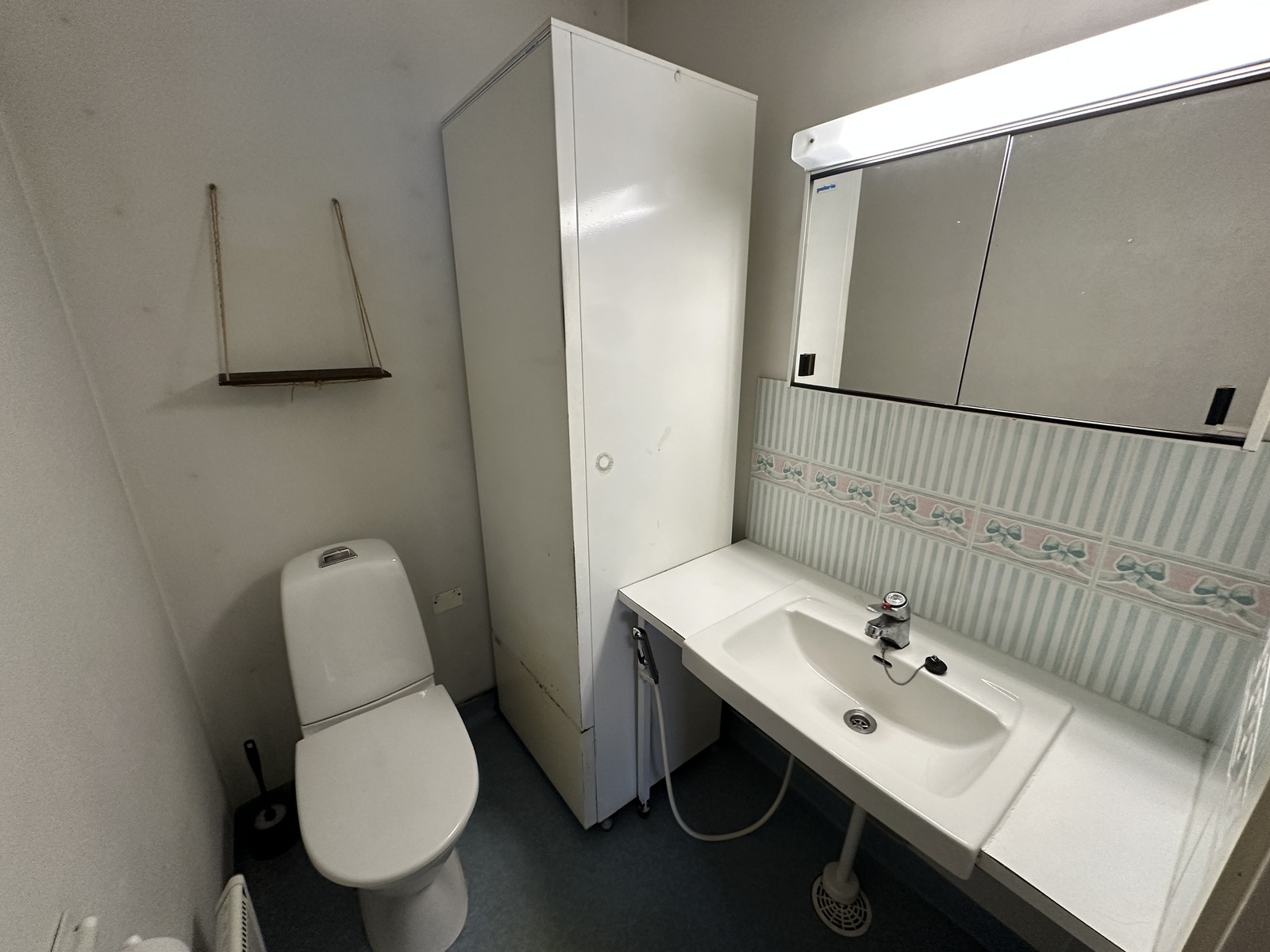 Varusteet: lattiaan asennettu WC, bidee, peilikaappi